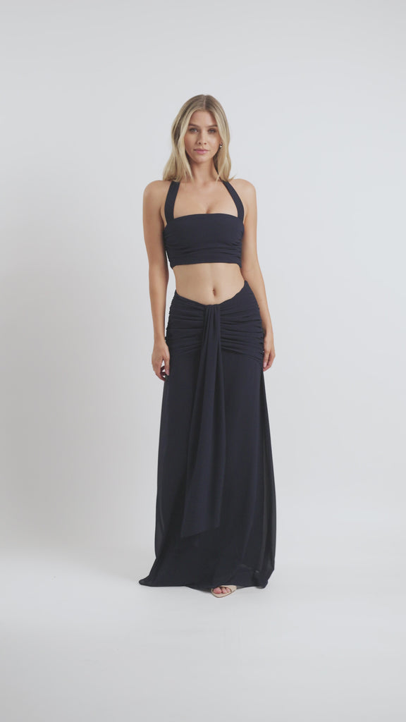 The Andre Set is a contemporary expression of elegance and ease. The halter-style crop top is ruched for a flattering, sculpted fit, while the georgette maxi skirt features a gathered panel at the waist that flows into a dramatic front sash. Designed to elongate the silhouette with soft draping and fluid movement, this set strikes the perfect balance between modern sophistication and timeless allure.