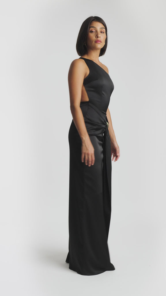 The Clea Dress is crafted from luxe satin with a fluid, body-skimming silhouette. It features a one-shoulder neckline and an open back, detailed with an asymmetric adjustable strap for a modern edge. A draped panel across the stomach extends into a soft sash, finished with our signature gold hardware bangle. A thigh-high split adds movement and allure, making Clea a bold yet refined statement piece.