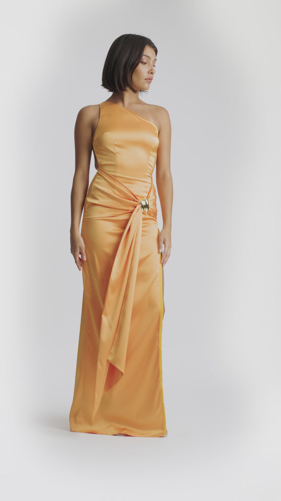 The Clea Dress is crafted from luxe satin with a fluid, body-skimming silhouette. It features a one-shoulder neckline and an open back, detailed with an asymmetric adjustable strap for a modern edge. A draped panel across the stomach extends into a soft sash, finished with our signature gold hardware bangle. A thigh-high split adds movement and allure, making Clea a bold yet refined statement piece.