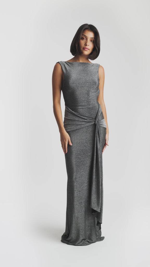 The Nahla Dress is cut from a metallic jersey, which catches the light with every move. The elegant high boat neckline travels over the shoulder and scoops to a low sexy back. The dress features a flattering loop and sash detail design at the hip.
