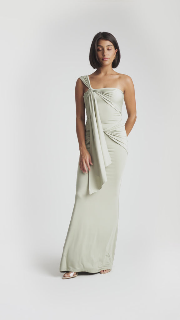 The Nyla Dress is crafted from soft, stretchy jersey for a sculpted fit. It features a twisted band detail across the hips and a twist and sash that wrap over one shoulder and across the front neckline, creating bold, dynamic lines. A sleek silhouette with striking detail.
