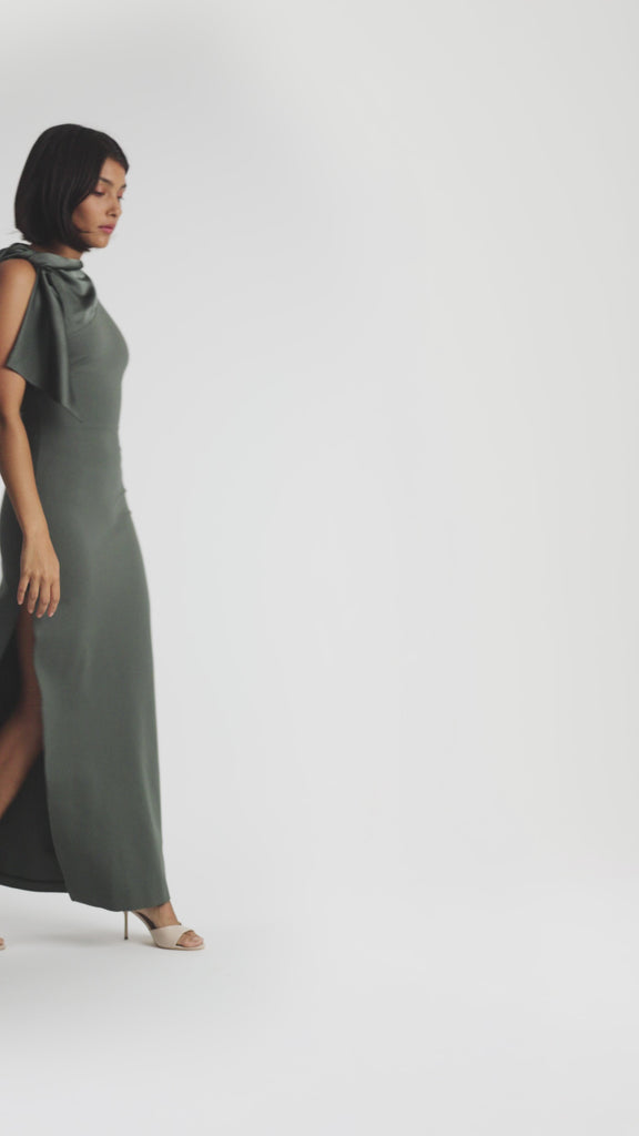 The Shilo Dress is cut from sculpting ponte and features a contrasting satin shoulder panel with a delicate tie-up detail for a touch of elegance. The straight-cut silhouette is finished with a thigh-high split at the right leg, balancing structure with fluidity and edge.