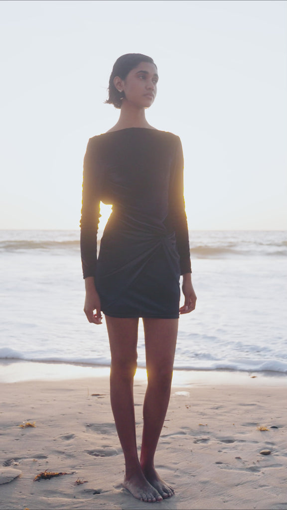 The Stevie Dress is the perfect blend of sophistication and allure. Crafted from plush velvet, this mini features a sleek high neckline and long sleeves that balance its daring open back. A flattering twist detail at the front cinches the waist, creating soft draping through the skirt for a sculpted yet effortless finish.