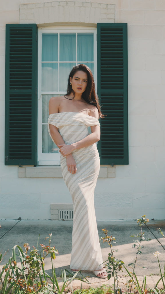 The Sebastian Dress in stripe print is a statement in ethereal elegance, crafted from soft stretch mesh that contours the body with effortless fluidity. This romantic design features an off-the-shoulder neckline that drapes into a beautiful cowl back, balanced by thin tie-up straps that keep the silhouette perfectly in place. The floor-length mermaid skirt creates a graceful, sculpted profile that flows with every step.