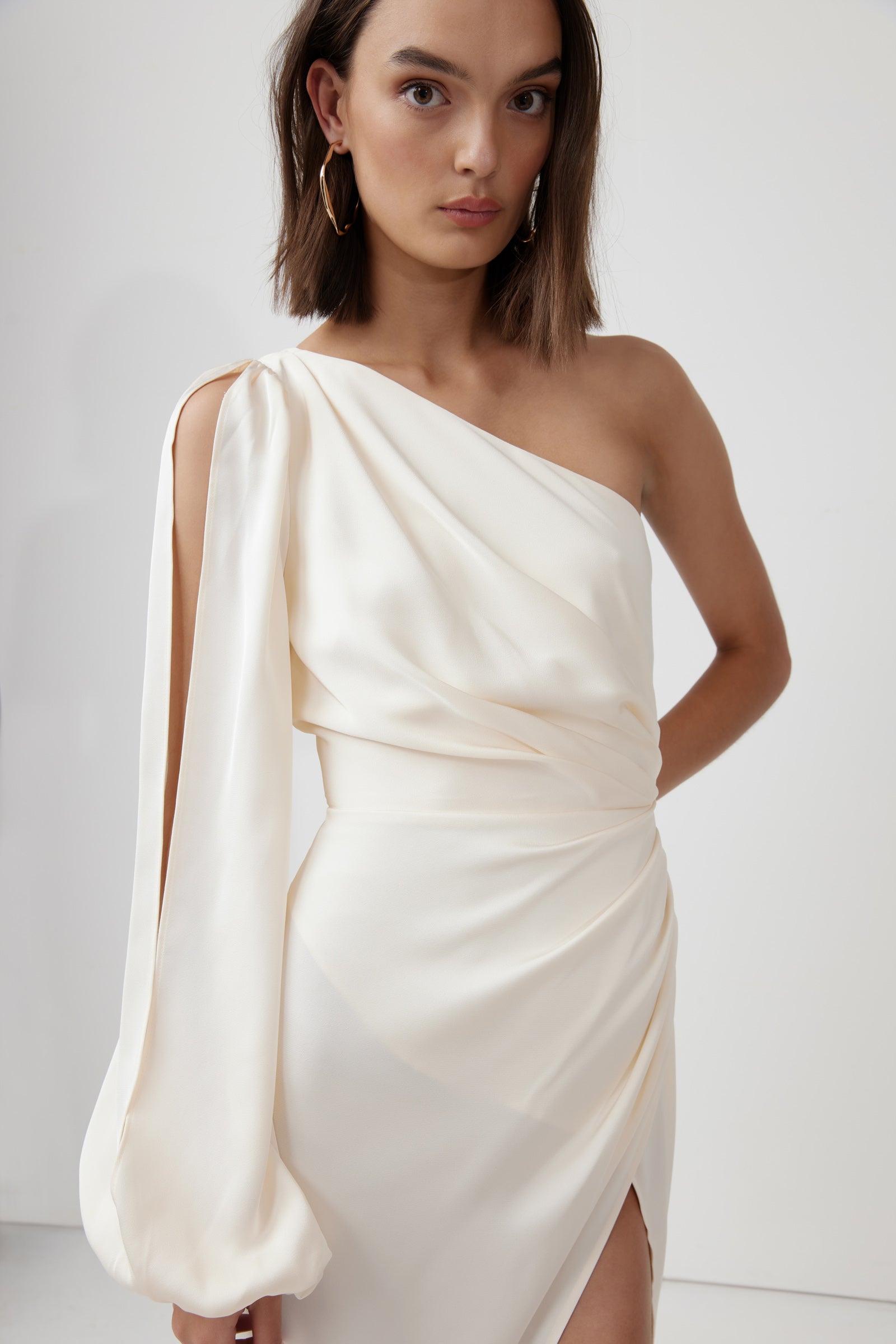 Rita Dress white one-shoulder fitted design with draped detail, ideal for formal and cocktail occasions by Studio Lexi