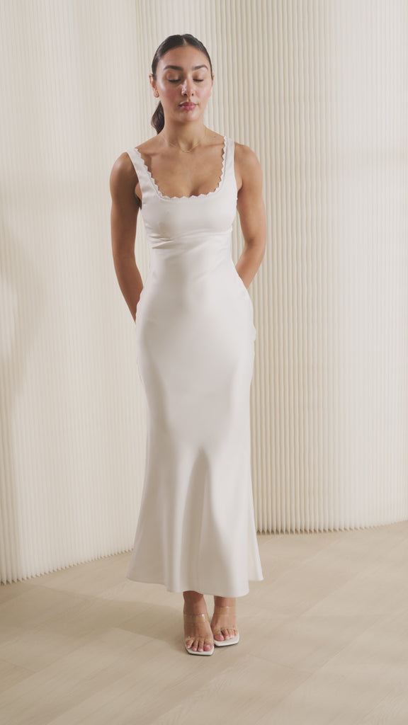 The Valentine Dress is crafted from luxe satin with a flattering scoop neckline accented by delicate lace trim. The soft mermaid-shaped silhouette skims the body beautifully, with an under-bust seam that enhances the figure. Falling to ankle length, this timeless design balances sophistication with romantic detail.
